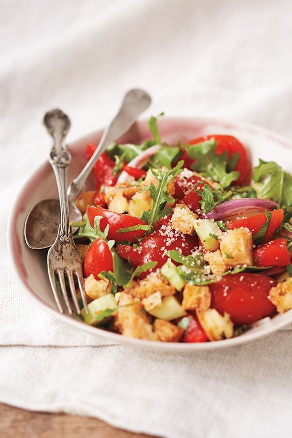 Now that’s something you can feel comfortable eating all the time (and believe me, you will). This gluten-free panzanella dish is simple to make and, if you use jarred peppers, requires no cooking at all.