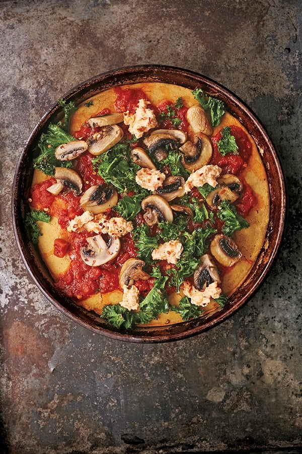- Add the Heirloom Tomato Sauce, using the back of a large tablespoon to coat the entire surface of the crust, except for a ½-inch around the edge. Top with the kale, mushrooms, and scallion, and then drizzle with the Carrot Cashew Herb Sauce. Place under the broiler until the kale turns crispy, 4 to 6 minutes. Sprinkle with red pepper flakes and serve warm.